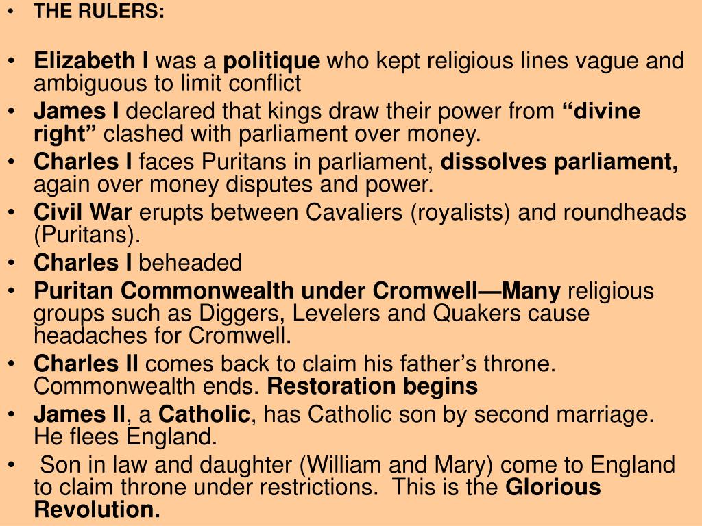 THE RULERS: Elizabeth I was a politique who kept religious lines vague and ambiguous to limit conflict James I declared that kings draw their power from “divine right” clashed with parliament over money. Charles I faces Puritans in parliament, dissolves parliament, again over money disputes and power. Civil War erupts between Cavaliers (royalists) and roundheads (Puritans). Charles I beheaded Puritan Commonwealth under Cromwell—Many religious groups such as Diggers, Levelers and Quakers cause headaches for Cromwell. Charles II comes back to claim his father’s throne. Commonwealth ends. Restoration begins James II, a Catholic, has Catholic son by second marriage. He flees England. Son in law and daughter (William and Mary) come to England to claim throne under restrictions. This is the Glorious Revolution.