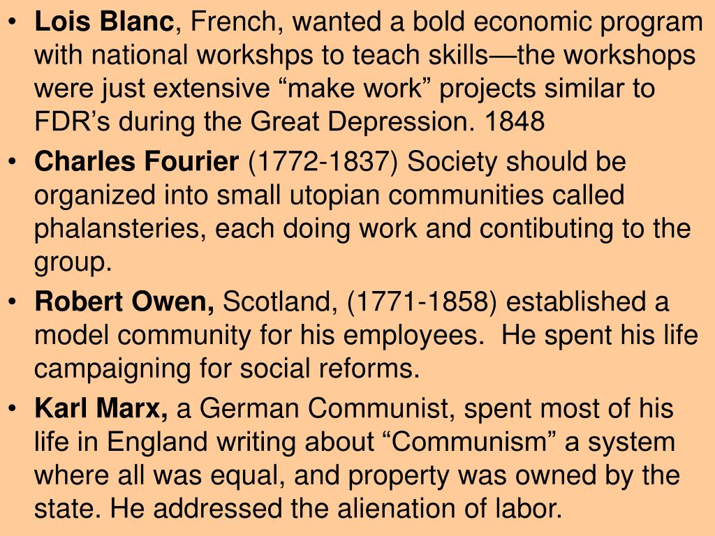 Lois Blanc, French, wanted a bold economic program with national workshps to teach skills—the workshops were just extensive “make work” projects similar to FDR’s during the Great Depression. 1848 Charles Fourier (1772-1837) Society should be organized into small utopian communities called phalansteries, each doing work and contibuting to the group. Robert Owen, Scotland, (1771-1858) established a model community for his employees. He spent his life campaigning for social reforms. Karl Marx, a German Communist, spent most of his life in England writing about “Communism” a system where all was equal, and property was owned by the state. He addressed the alienation of labor.