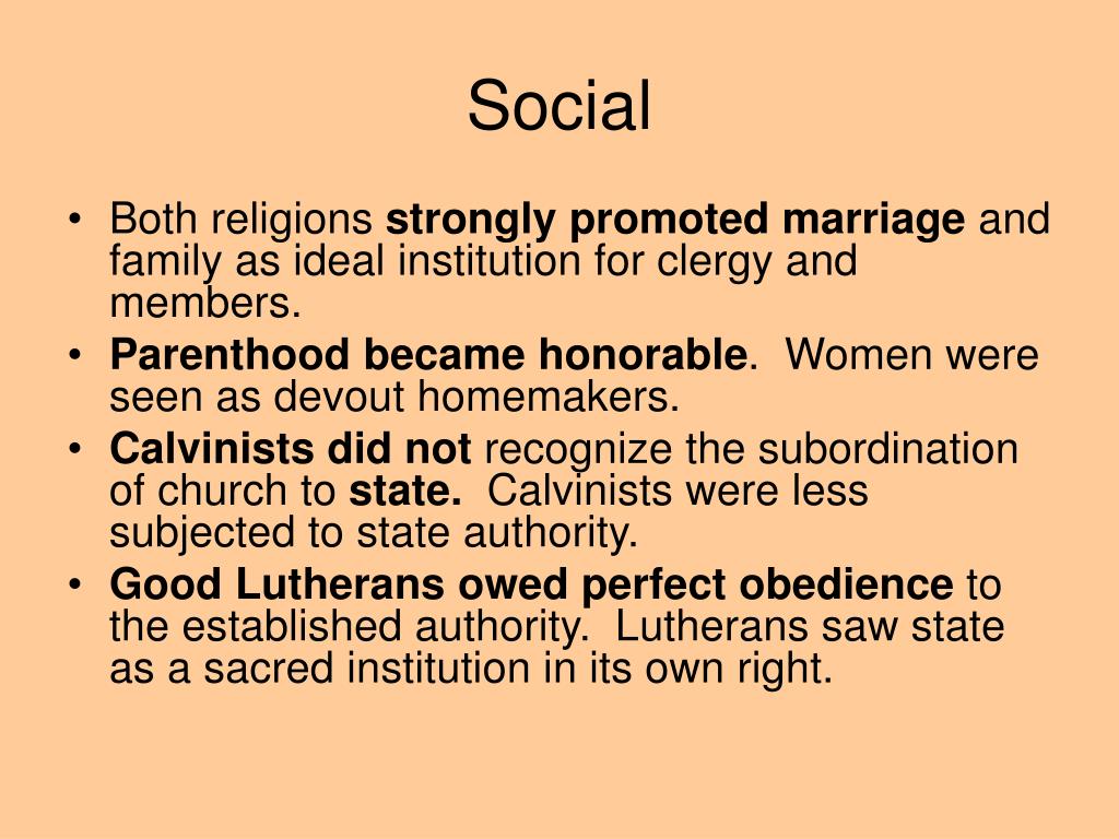 Social • Both religions strongly promoted marriage and family as ideal institution for clergy and members. • Parenthood became honorable. Women were seen as devout homemakers. • Calvinists did not recognize the subordination of church to state. Calvinists were less subjected to state authority. • Good Lutherans owed perfect obedience to the established authority. Lutherans saw state as a sacred institution in its own right.