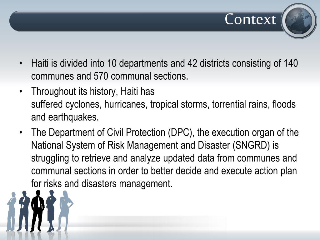 Context • Haiti is divided into 10 departments and 42 districts consisting of 140 communes and 570 communal sections. • Throughout its history, Haiti has suffered cyclones, hurricanes, tropical storms, torrential rains, floods and earthquakes. • The Department of Civil Protection (DPC), the execution organ of the National System of Risk Management and Disaster (SNGRD) is struggling to retrieve and analyze updated data from communes and communal sections in order to better decide and execute action plan for risks and disasters management.