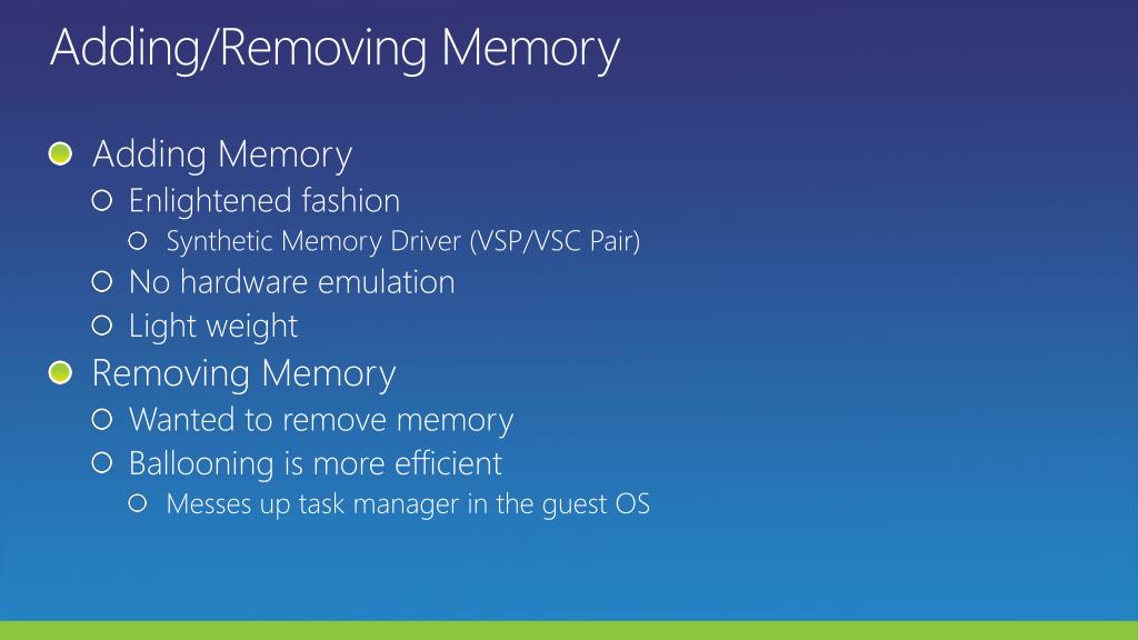 Adding/Removing Memory • Adding Memory • Enlightened fashion • Synthetic Memory Driver (VSP/VSC Pair) • No hardware emulation • Light weight • Removing Memory • Wanted to remove memory • Ballooning is more efficient • Messes up task manager in the guest OS