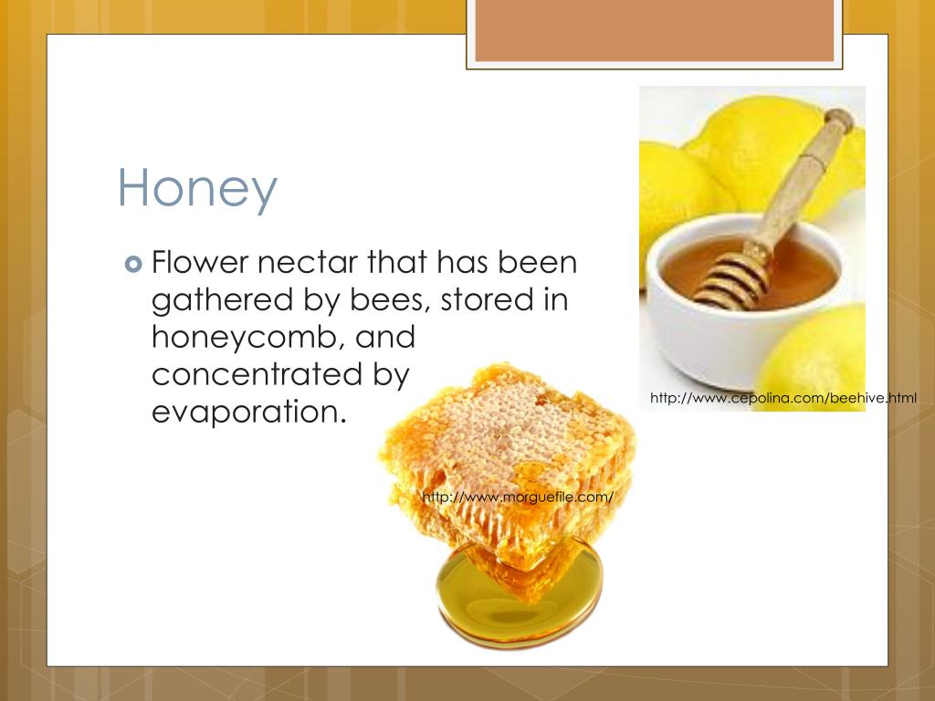 Honey • Flower nectar that has been gathered by bees, stored in honeycomb, and concentrated by evaporation. http://www.cepolina.com/beehive.html http://www.morguefile.com/