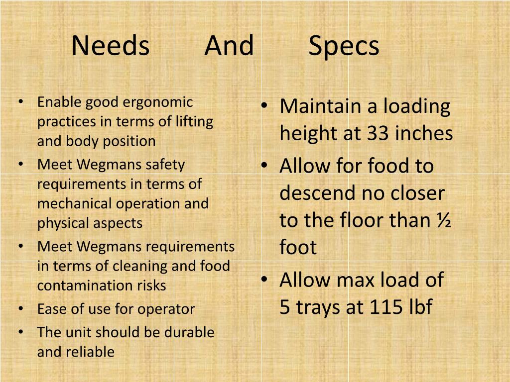 And Specs Needs • Enable good ergonomic practices in terms of lifting and body position • Meet Wegmans safety requirements in terms of mechanical operation and physical aspects • Meet Wegmans requirements in terms of cleaning and food contamination risks • Ease of use for operator • The unit should be durable and reliable • Maintain a loading height at 33 inches • Allow for food to descend no closer to the floor than ½ foot • Allow max load of 5 trays at 115 lbf
