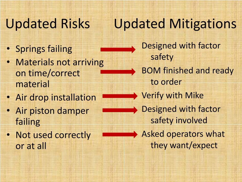 Updated Risks Updated Mitigations • Designed with factor safety • BOM finished and ready to order • Verify with Mike • Designed with factor safety involved • Asked operators what they want/expect • Springs failing • Materials not arriving on time/correct material • Air drop installation • Air piston damper failing • Not used correctlyor at all