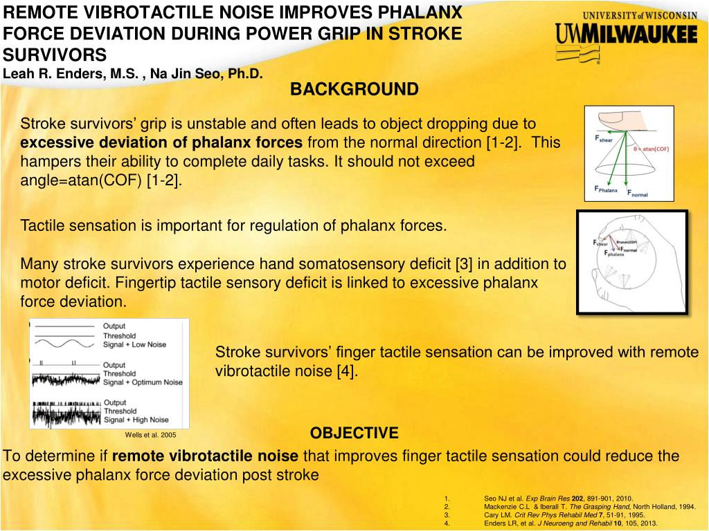 REMOTE VIBROTACTILE NOISE IMPROVES PHALANX FORCE DEVIATION DURING POWER GRIP IN STROKE SURVIVORSLeah R. Enders, M.S. , Na Jin Seo, Ph.D. Stroke survivors’ grip is unstable and often leads to object dropping due to excessive deviation of phalanx forces from the normal direction [1-2]. This hampers their ability to complete daily tasks. It should not exceed angle=atan(COF) [1-2]. Tactile sensation is important for regulation of phalanx forces. Many stroke survivors experience hand somatosensory deficit [3] in addition to motor deficit. Fingertip tactile sensory deficit is linked to excessive phalanx force deviation. BACKGROUND Stroke survivors’ finger tactile sensation can be improved with remote vibrotactile noise [4]. OBJECTIVE To determine if remote vibrotactile noise that improves finger tactile sensation could reduce the excessive phalanx force deviation post stroke • Wells et al. 2005 • Seo NJ et al. Exp Brain Res 202, 891-901, 2010. • Mackenzie C.L & Iberall T. The Grasping Hand, North Holland, 1994. • Cary LM. Crit Rev Phys Rehabil Med7, 51-91, 1995. • Enders LR, et al. J Neuroeng and Rehabil 10, 105, 2013.