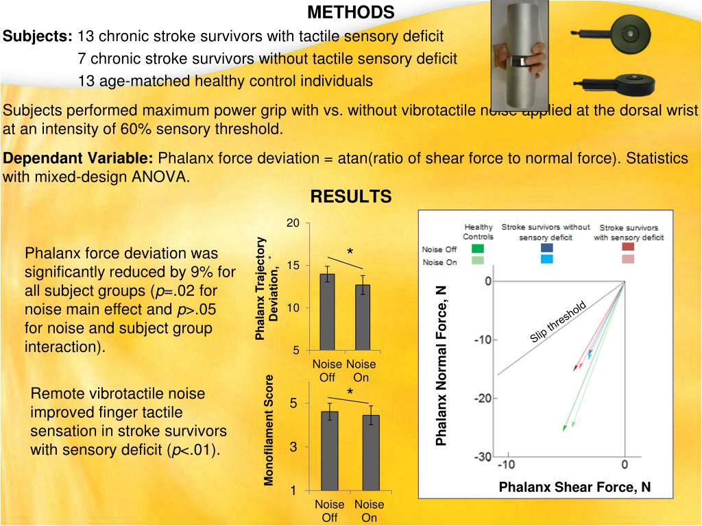 METHODS Subjects: 13 chronic stroke survivors with tactile sensory deficit 7 chronic stroke survivors without tactile sensory deficit 13 age-matched healthy control individuals Subjects performed maximum power grip with vs. without vibrotactile noise applied at the dorsal wrist at an intensity of 60% sensory threshold. Dependant Variable: Phalanx force deviation =atan(ratio of shear force to normal force). Statistics with mixed-design ANOVA. RESULTS Phalanx force deviation was significantly reduced by 9% for all subject groups (p=.02 for noise main effect and p>.05 for noise and subject group interaction). * Remote vibrotactile noise improved finger tactile sensation in stroke survivors with sensory deficit (p<.01). * Slip threshold Phalanx Normal Force, N Phalanx Shear Force, N