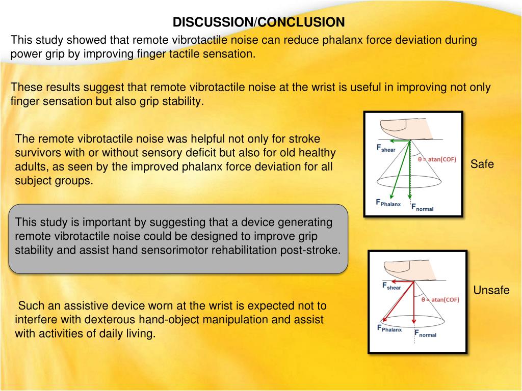 DISCUSSION/CONCLUSION This study showed that remote vibrotactile noise can reduce phalanx force deviation during power grip by improving finger tactile sensation. These results suggest that remote vibrotactile noise at the wrist is useful in improving not only finger sensation but also grip stability. The remote vibrotactile noise was helpful not only for stroke survivors with or without sensory deficit but also for old healthy adults, as seen by the improved phalanx force deviation for all subject groups. This study is important by suggesting that a device generating remote vibrotactile noise could be designed to improve grip stability and assist hand sensorimotor rehabilitation post-stroke. Such an assistive device worn at the wrist is expected not to interfere with dexterous hand-object manipulation and assist with activities of daily living. Safe Unsafe