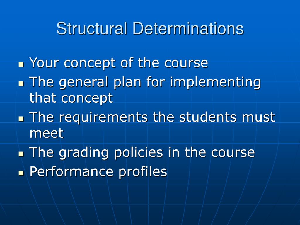 Structural Determinations • Your concept of the course • The general plan for implementing that concept • The requirements the students must meet • The grading policies in the course • Performance profiles