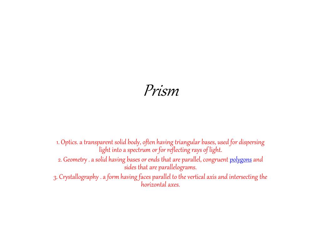 Prism 1. Optics. a transparent solid body, often having triangular bases, used for dispersing light into a spectrum or for reflecting rays of light. 2. Geometry . a solid having bases or ends that are parallel, congruent polygons and sides that are parallelograms. 3. Crystallography . a form having faces parallel to the vertical axis and intersecting the horizontal axes.