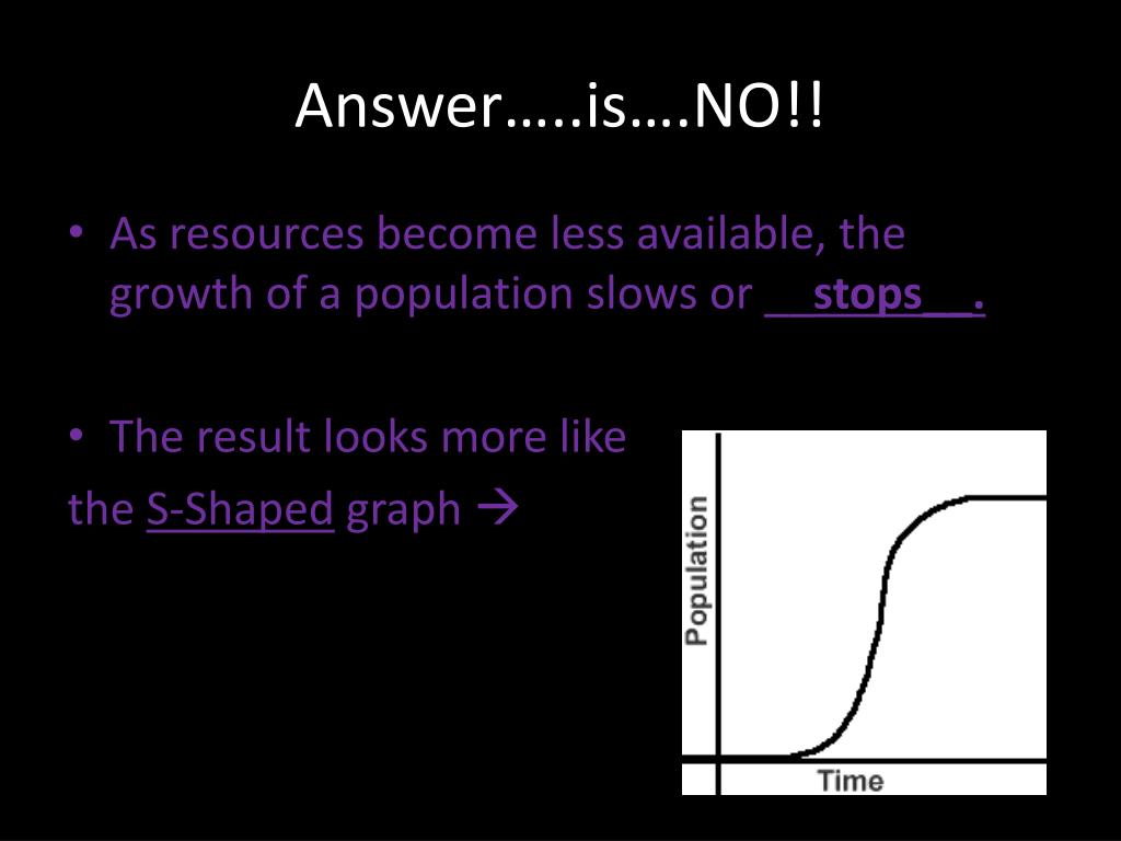 Answer…..is….NO!! • As resources become less available, the growth of a population slows or __stops__. • The result looks more like the S-Shaped graph