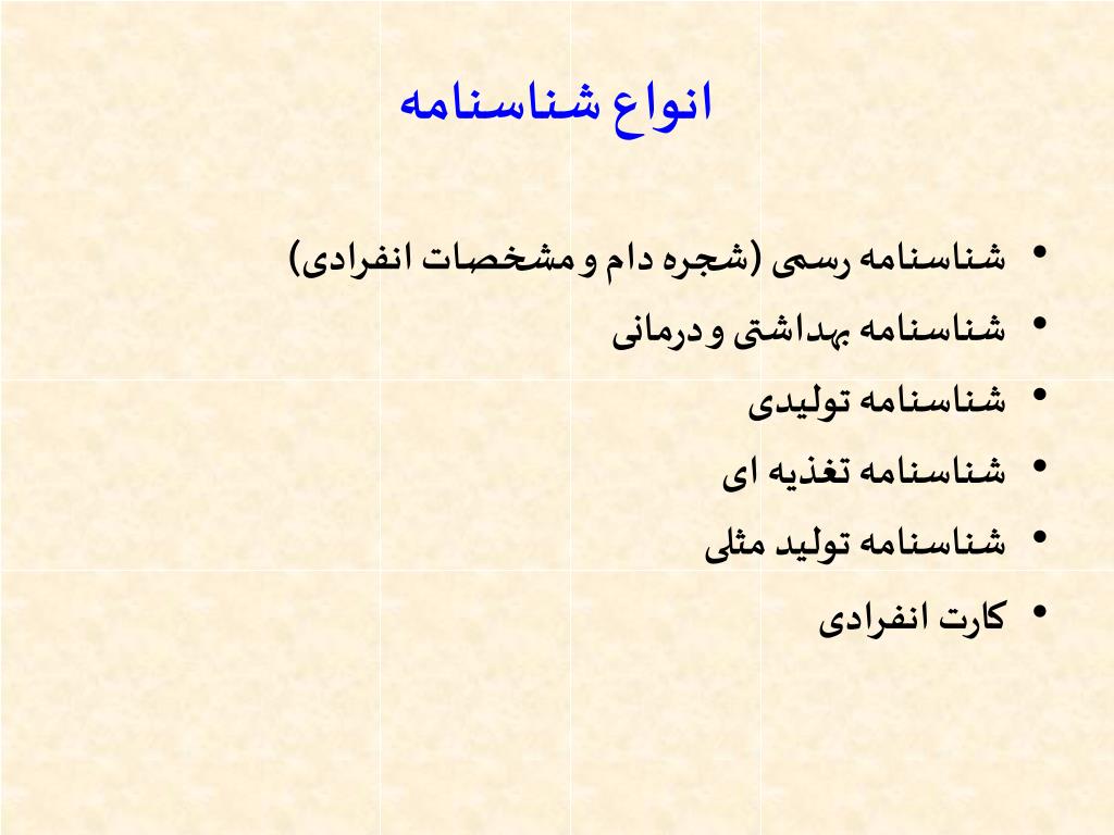 انواع شناسنامه • شناسنامه رسمی (شجره دام و مشخصات انفرادی) • شناسنامه بهداشتی و درمانی • شناسنامه تولیدی • شناسنامه تغذیه ای • شناسنامه تولید مثلی • کارت انفرادی