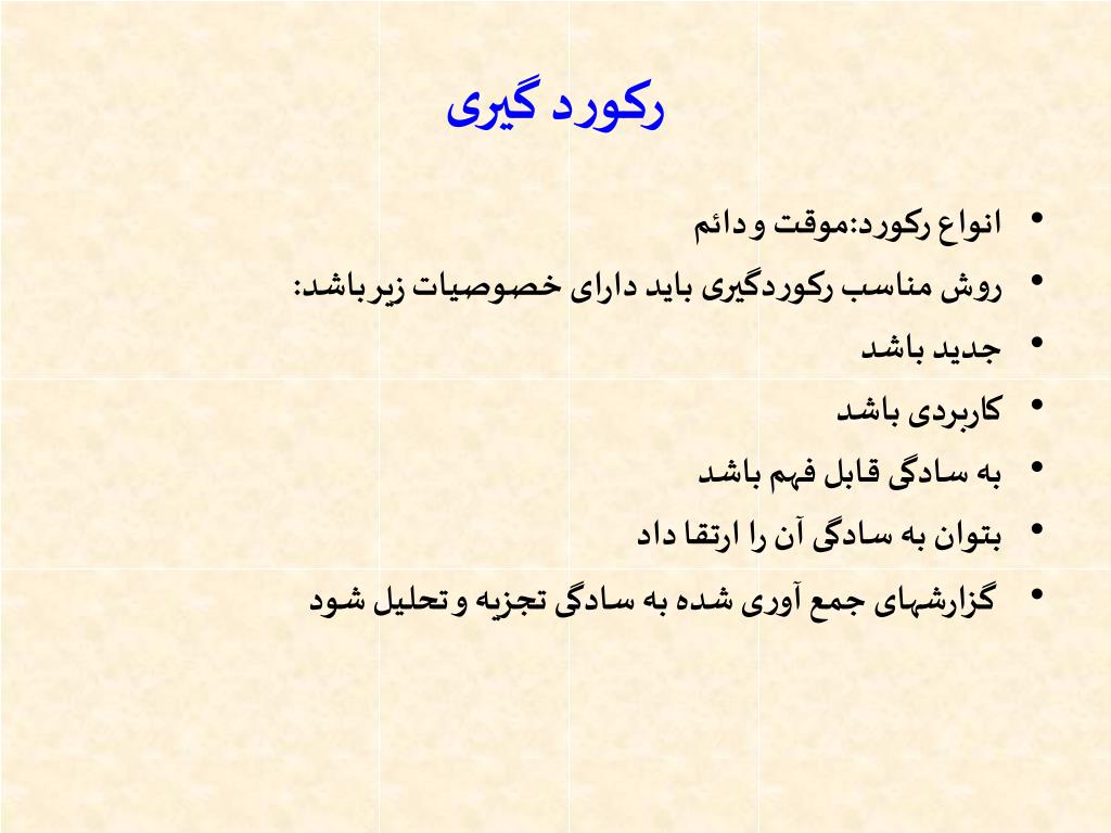 رکورد گیری • انواع رکورد:موقت و دائم • روش مناسب رکوردگیری باید دارای خصوصیات زیر باشد: • جدید باشد • کاربردی باشد • به سادگی قابل فهم باشد • بتوان به سادگی آن را ارتقا داد • گزارشهای جمع آوری شده به سادگی تجزیه و تحلیل شود