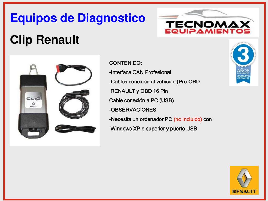 Equipos de Diagnostico Clip Renault CARACTERISTICAS: -Interface CAN profesional, para el grupo RENAULT -Diagnosis de todos los sistemas -Reprogamacion, codificacion… -Electronica del sistema de inyeccion -Transmision automatica -Electronica del ABS -Inmovilizador electronico - y sistema de seguridad -Visualiza TODA la informacion del vehiculo -Recupera informacion de todas las UCE´s incluidas fallas almacenadas permanentes. -Chequeo red multiplex -Chequeos red CAN bus -Chequeo sistema iny Diesel / Nafta -Chequeo funciones sistema UCE´s -Chequeo Airbag -Chequeo sistema neumatico -Chequeo sistema ABS/ESP -Chequeo sistema aire acondicionado -Chequeo puertas -Chequeo OBD -Base de datos tecnica (acceso a notas tecnicas -y mucho mas
