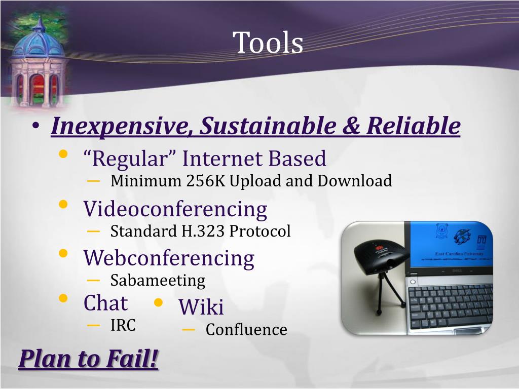 “Regular” Internet Based • Minimum 256K Upload and Download • Videoconferencing • Chat • Webconferencing • Wiki • Standard H.323 Protocol • IRC • Sabameeting • Confluence Tools • Inexpensive, Sustainable & Reliable Plan to Fail!