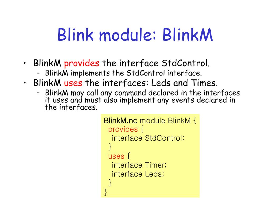 Blink module: BlinkM • BlinkM provides the interface StdControl. • BlinkM implements the StdControl interface. • BlinkM uses the interfaces: Leds and Times. • BlinkM may call any command declared in the interfaces it uses and must also implement any events declared in the interfaces. BlinkM.nc module BlinkM {provides { interface StdControl; }uses { interface Timer; interface Leds; }}