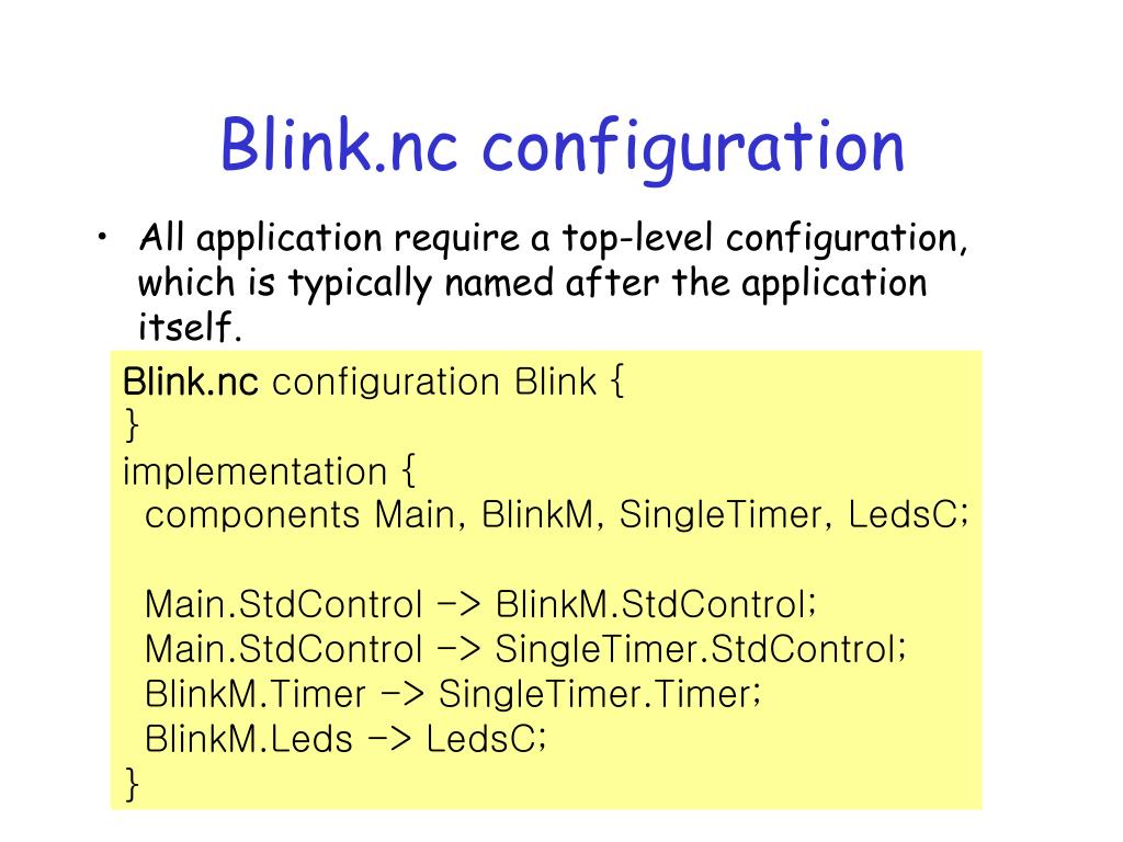 Blink.nc configuration • All application require a top-level configuration, which is typically named after the application itself. Blink.nc configuration Blink {}implementation { components Main, BlinkM, SingleTimer, LedsC; Main.StdControl -> BlinkM.StdControl; Main.StdControl -> SingleTimer.StdControl; BlinkM.Timer -> SingleTimer.Timer; BlinkM.Leds -> LedsC;}