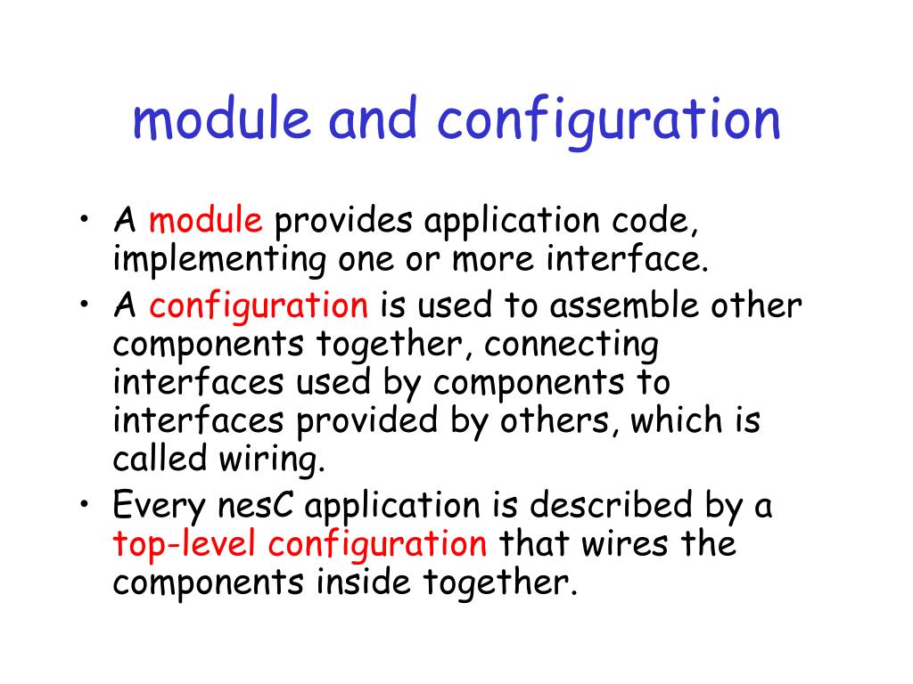 module and configuration • A module provides application code, implementing one or more interface. • A configuration is used to assemble other components together, connecting interfaces used by components to interfaces provided by others, which is called wiring. • Every nesC application is described by a top-level configuration that wires the components inside together.
