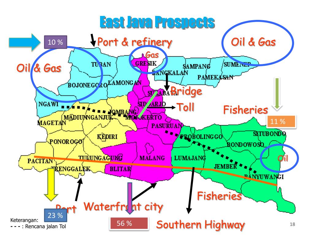 East Java Prospects Port & refinery Oil & Gas 10 % Gas Oil & Gas Bridge Toll Fisheries 11 % Oil Fisheries Waterfront city Port 23 % Keterangan: - - - : Rencana jalan Tol Southern Highway 56 %