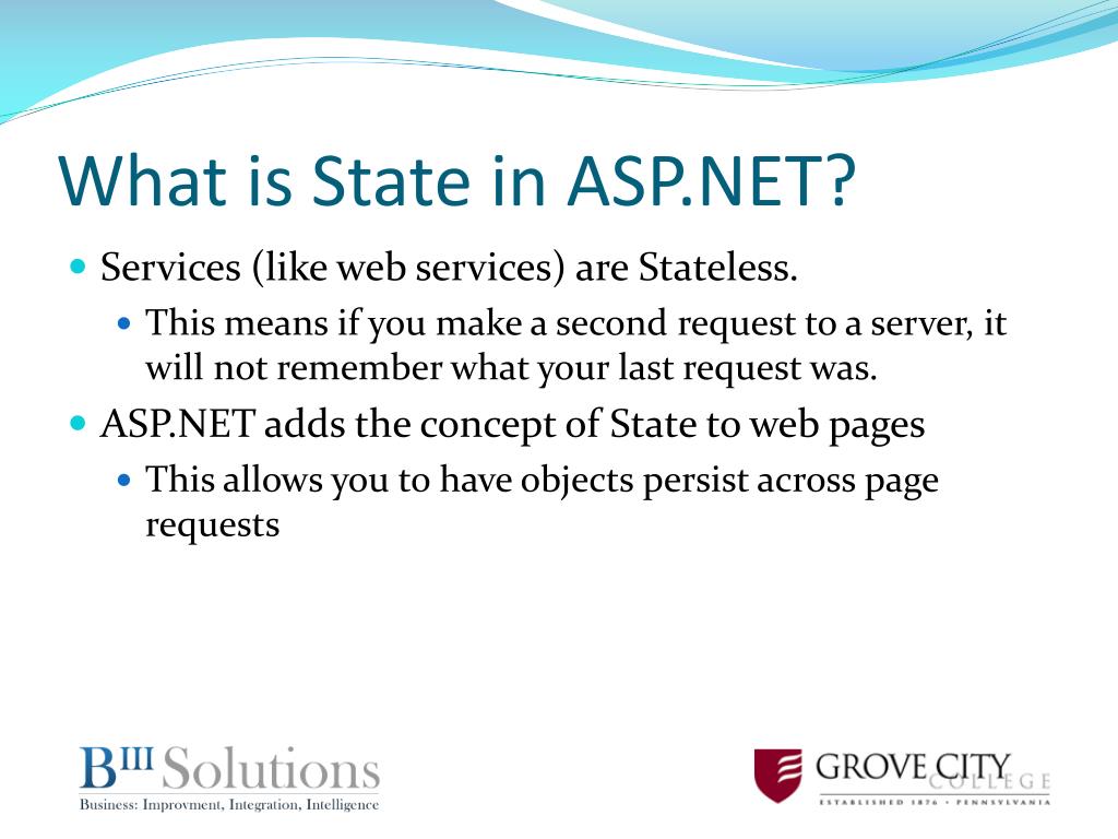 State Management. Not like the State of Virginia. What is State in ASP.NET?. Services (like web services) are Stateless. This means if you make a second request to a server, it will not remember what your last request was. ASP.NET adds the concept of State to web pages