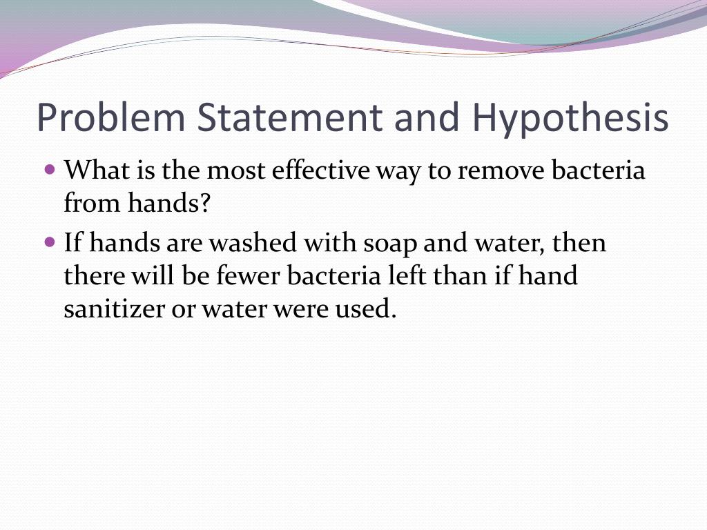 Problem Statement and Hypothesis • What is the most effective way to remove bacteria from hands? • If hands are washed with soap and water, then there will be fewer bacteria left than if hand sanitizer or water were used.