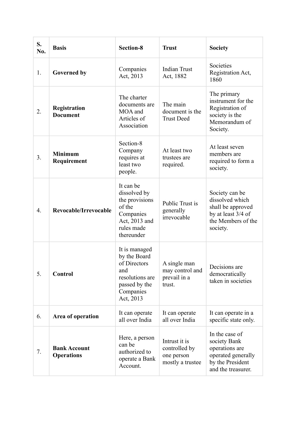 S. No. Basis Section-8 Trust Society Societies Registration Act, 1860 Companies Act, 2013 Indian Trust Act, 1882 1. Governed by The primary instrument for the Registration of society is the Memorandum of Society. The charter documents are MOA and Articles of Association The main document is the Trust Deed Registration Document 2. Section-8 Company requires at least two people. At least seven members are required to form a society. At least two trustees are required. Minimum Requirement 3. It can be dissolved by the provisions of the Companies Act, 2013 and rules made thereunder Society can be dissolved which shall be approved by at least 3/4 of the Members of the society. Public Trust is generally irrevocable 4. Revocable/Irrevocable It is managed by the Board of Directors and resolutions are passed by the Companies Act, 2013 A single man may control and prevail in a trust. Decisions are democratically taken in societies 5. Control It can operate all over India It can operate all over India It can operate in a specific state only. 6. Area of operation In the case of society Bank operations are operated generally by the President and the treasurer. Here, a person can be authorized to operate a Bank Account. Intrust it is controlled by one person mostly a trustee Bank Account Operations 7.