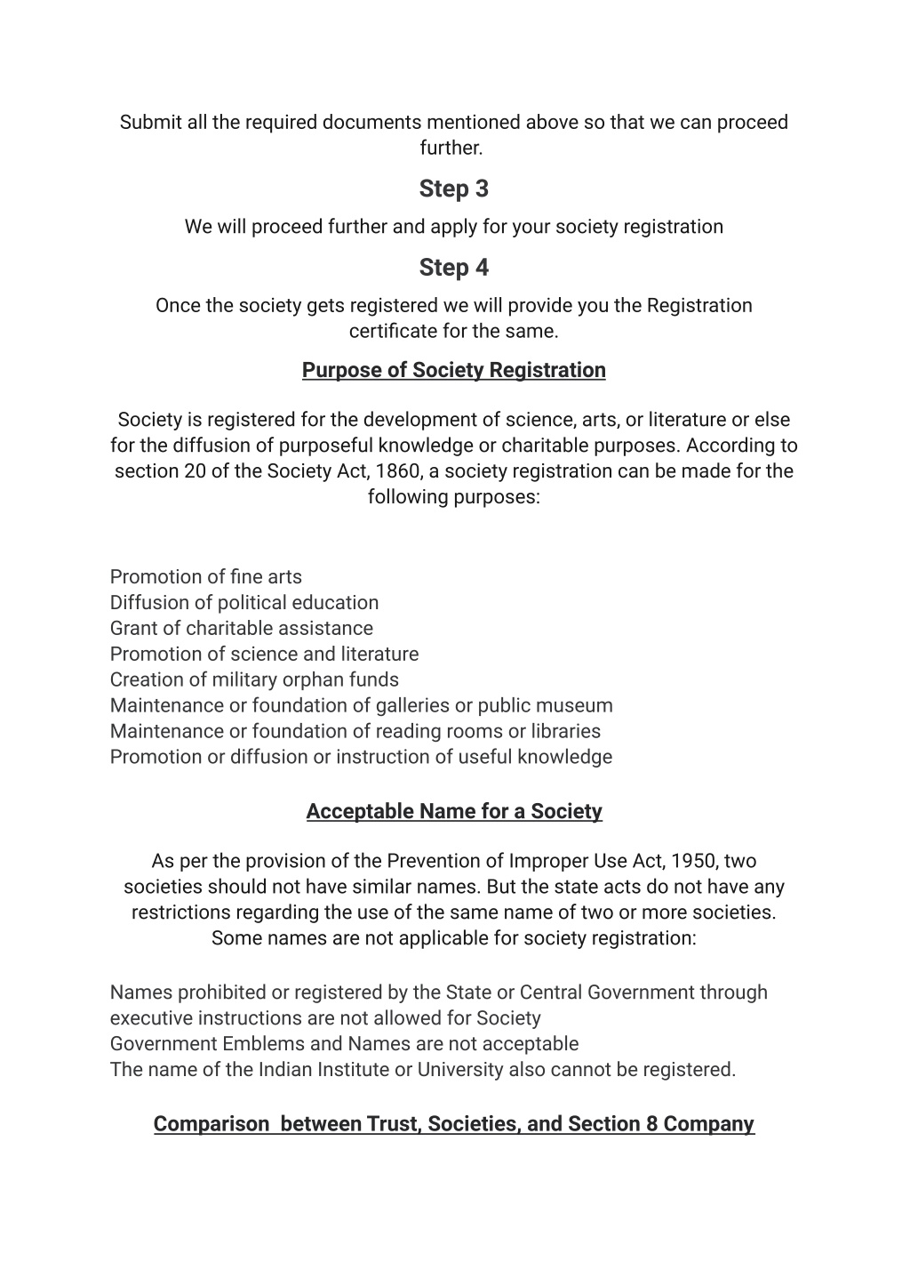 Submit all the required documents mentioned above so that we can proceed further. Step 3 We will proceed further and apply for your society registration Step 4 Once the society gets registered we will provide you the Registration certificate for the same. Purpose of Society Registration Society is registered for the development of science, arts, or literature or else for the diffusion of purposeful knowledge or charitable purposes. According to section 20 of the Society Act, 1860, a society registration can be made for the following purposes: Promotion of fine arts Diffusion of political education Grant of charitable assistance Promotion of science and literature Creation of military orphan funds Maintenance or foundation of galleries or public museum Maintenance or foundation of reading rooms or libraries Promotion or diffusion or instruction of useful knowledge Acceptable Name for a Society As per the provision of the Prevention of Improper Use Act, 1950, two societies should not have similar names. But the state acts do not have any restrictions regarding the use of the same name of two or more societies. Some names are not applicable for society registration: Names prohibited or registered by the State or Central Government through executive instructions are not allowed for Society Government Emblems and Names are not acceptable The name of the Indian Institute or University also cannot be registered. Comparison between Trust, Societies, and Section 8 Company