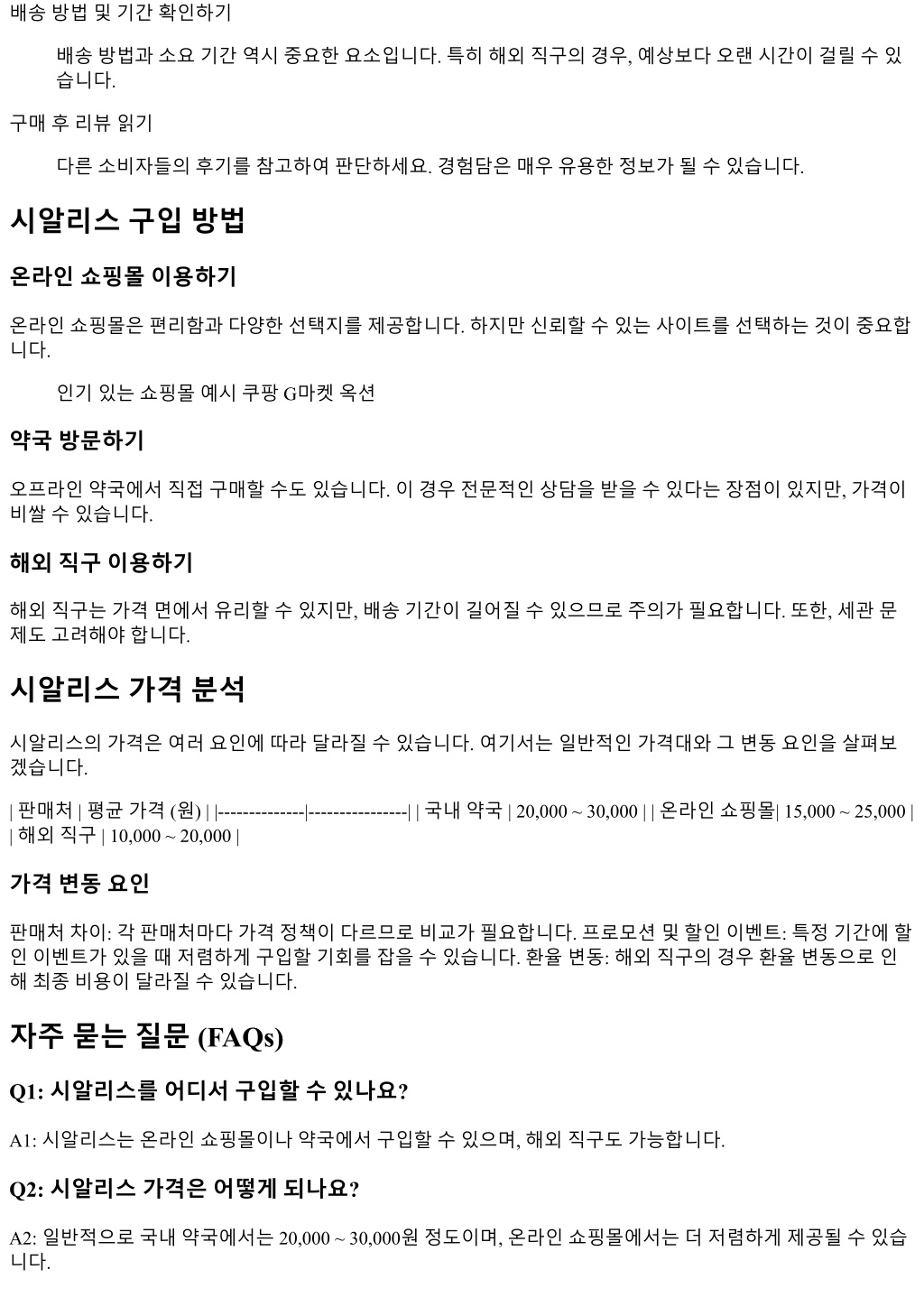 배송방법및기간확인하기 배송방법과소요기간역시중요한요소입니다. 특히해외직구의경우, 예상보다오랜시간이걸릴수있 습니다. 구매후리뷰읽기 다른소비자들의후기를참고하여판단하세요. 경험담은매우유용한정보가될수있습니다. 시알리스구입방법 온라인쇼핑몰이용하기 온라인쇼핑몰은편리함과다양한선택지를제공합니다. 하지만신뢰할수있는사이트를선택하는것이중요합 니다. 인기있는쇼핑몰예시쿠팡 G마켓옥션 약국방문하기 오프라인약국에서직접구매할수도있습니다. 이경우전문적인상담을받을수있다는장점이있지만, 가격이 비쌀수있습니다. 해외직구이용하기 해외직구는가격면에서유리할수있지만, 배송기간이길어질수있으므로주의가필요합니다. 또한, 세관문 제도고려해야합니다. 시알리스가격분석 시알리스의가격은여러요인에따라달라질수있습니다. 여기서는일반적인가격대와그변동요인을살펴보 겠습니다. | 판매처 | 평균가격 (원) | |--------------|----------------| | 국내약국 | 20,000 ~ 30,000 | | 온라인쇼핑몰| 15,000 ~ 25,000 | | 해외직구 | 10,000 ~ 20,000 | 가격변동요인 판매처차이: 각판매처마다가격정책이다르므로비교가필요합니다. 프로모션및할인이벤트: 특정기간에할 인이벤트가있을때저렴하게구입할기회를잡을수있습니다. 환율변동: 해외직구의경우환율변동으로인 해최종비용이달라질수있습니다. 자주묻는질문 (FAQs) Q1: 시알리스를어디서구입할수있나요? A1: 시알리스는온라인쇼핑몰이나약국에서구입할수있으며, 해외직구도가능합니다. Q2: 시알리스가격은어떻게되나요? A2: 일반적으로국내약국에서는 20,000 ~ 30,000원정도이며, 온라인쇼핑몰에서는더저렴하게제공될수있습 니다.