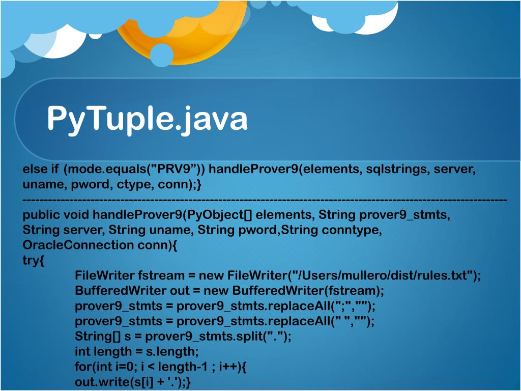 PyTuple.java else if (mode.equals("PRV9”)) handleProver9(elements, sqlstrings, server, uname, pword, ctype, conn);} ------------------------------------------------------------------------------------------------------------------ public void handleProver9(PyObject[] elements, String prover9_stmts, String server, String uname, String pword,Stringconntype, OracleConnection conn){ try{ FileWriterfstream = new FileWriter("/Users/mullero/dist/rules.txt"); BufferedWriter out = new BufferedWriter(fstream); prover9_stmts = prover9_stmts.replaceAll(";",""); prover9_stmts = prover9_stmts.replaceAll(" ",""); String[] s = prover9_stmts.split("."); int length = s.length; for(inti=0; i < length-1 ; i++){ out.write(s[i] + '.');}