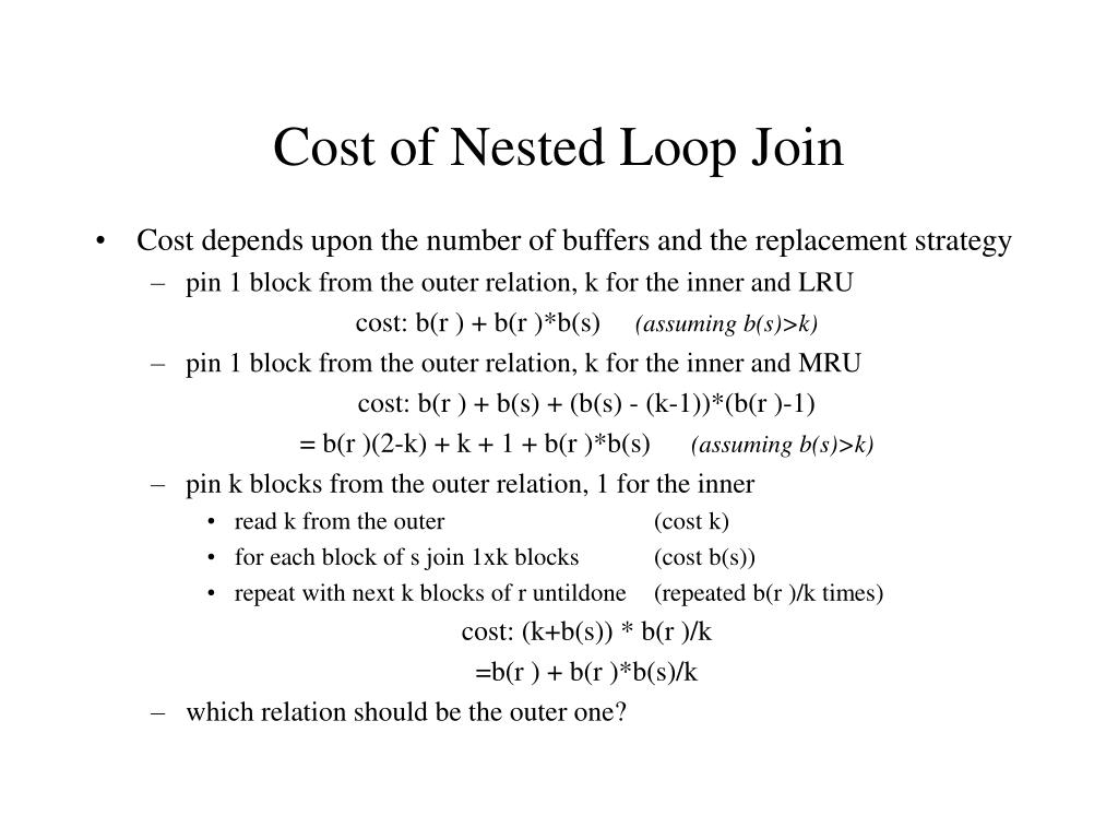 Cost of Nested Loop Join • Cost depends upon the number of buffers and the replacement strategy • pin 1 block from the outer relation, k for the inner and LRU cost: b(r ) + b(r )*b(s) (assuming b(s)>k) • pin 1 block from the outer relation, k for the inner and MRU cost: b(r ) + b(s) + (b(s) - (k-1))*(b(r )-1) = b(r )(2-k) + k + 1 + b(r )*b(s) (assuming b(s)>k) • pin k blocks from the outer relation, 1 for the inner • read k from the outer (cost k) • for each block of s join 1xk blocks (cost b(s)) • repeat with next k blocks of r untildone (repeated b(r )/k times) cost: (k+b(s)) * b(r )/k =b(r ) + b(r )*b(s)/k • which relation should be the outer one?