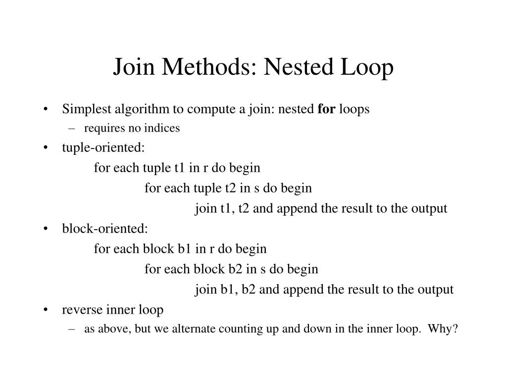 Join Methods: Nested Loop • Simplest algorithm to compute a join: nested for loops • requires no indices • tuple-oriented: for each tuple t1 in r do begin for each tuple t2 in s do begin join t1, t2 and append the result to the output • block-oriented: for each block b1 in r do begin for each block b2 in s do begin join b1, b2 and append the result to the output • reverse inner loop • as above, but we alternate counting up and down in the inner loop. Why?