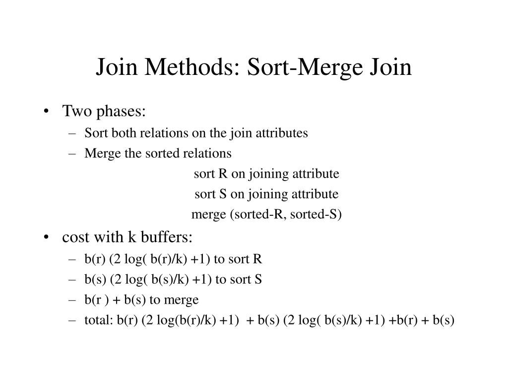 Join Methods: Sort-Merge Join • Two phases: • Sort both relations on the join attributes • Merge the sorted relations sort R on joining attribute sort S on joining attribute merge (sorted-R, sorted-S) • cost with k buffers: • b(r) (2 log( b(r)/k) +1) to sort R • b(s) (2 log( b(s)/k) +1) to sort S • b(r ) + b(s) to merge • total: b(r) (2 log(b(r)/k) +1) + b(s) (2 log( b(s)/k) +1) +b(r) + b(s)