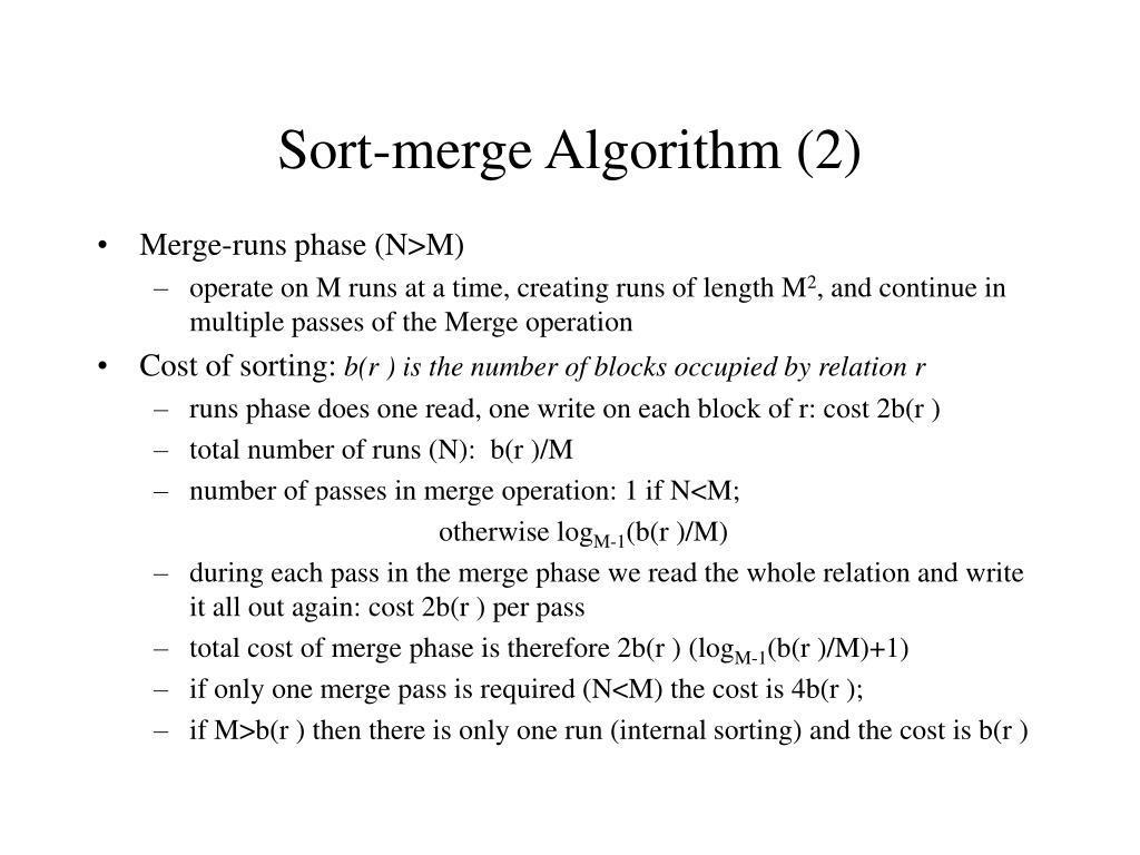 Sort-merge Algorithm (2) • Merge-runs phase (N>M) • operate on M runs at a time, creating runs of length M2, and continue in multiple passes of the Merge operation • Cost of sorting: b(r ) is the number of blocks occupied by relation r • runs phase does one read, one write on each block of r: cost 2b(r ) • total number of runs (N): b(r )/M • number of passes in merge operation: 1 if N<M; otherwise logM-1(b(r )/M) • during each pass in the merge phase we read the whole relation and write it all out again: cost 2b(r ) per pass • total cost of merge phase is therefore 2b(r ) (logM-1(b(r )/M)+1) • if only one merge pass is required (N<M) the cost is 4b(r ); • if M>b(r ) then there is only one run (internal sorting) and the cost is b(r )