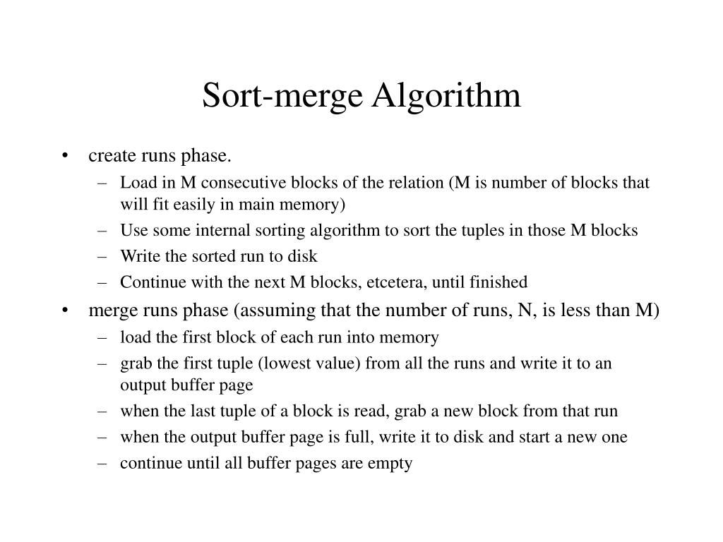 Sort-merge Algorithm • create runs phase. • Load in M consecutive blocks of the relation (M is number of blocks that will fit easily in main memory) • Use some internal sorting algorithm to sort the tuples in those M blocks • Write the sorted run to disk • Continue with the next M blocks, etcetera, until finished • merge runs phase (assuming that the number of runs, N, is less than M) • load the first block of each run into memory • grab the first tuple (lowest value) from all the runs and write it to an output buffer page • when the last tuple of a block is read, grab a new block from that run • when the output buffer page is full, write it to disk and start a new one • continue until all buffer pages are empty