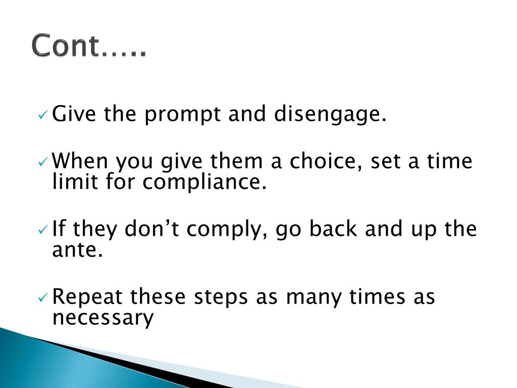 Cont….. • Give the prompt and disengage. • When you give them a choice, set a time limit for compliance. • If they don’t comply, go back and up the ante. • Repeat these steps as many times as necessary