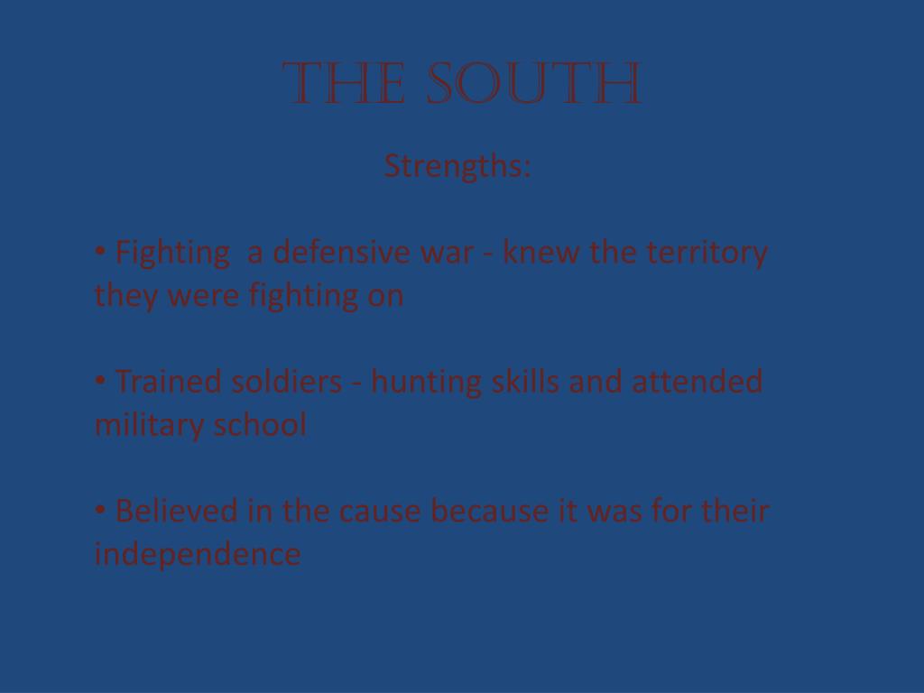 The South • Strengths: • Fighting a defensive war - knew the territory they were fighting on • Trained soldiers - hunting skills and attended military school • Believed in the cause because it was for their independence