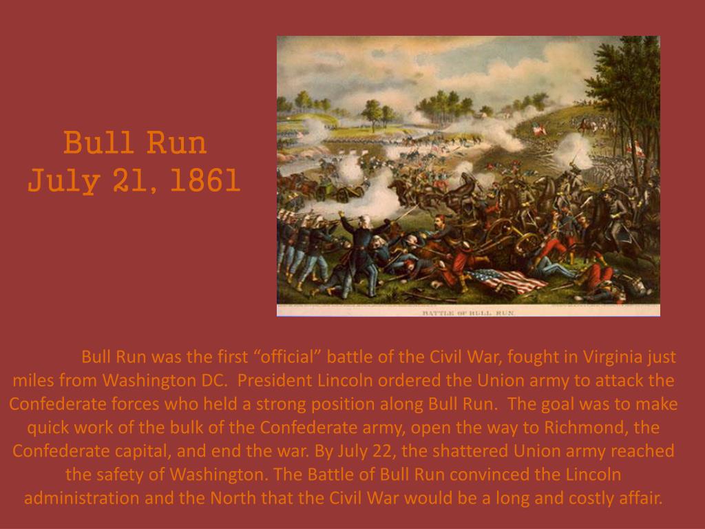 Bull Run July 21, 1861 Bull Run was the first “official” battle of the Civil War, fought in Virginia just miles from Washington DC. President Lincoln ordered the Union army to attack the Confederate forces who held a strong position along Bull Run. The goal was to make quick work of the bulk of the Confederate army, open the way to Richmond, the Confederate capital, and end the war. By July 22, the shattered Union army reached the safety of Washington. The Battle of Bull Run convinced the Lincoln administration and the North that the Civil War would be a long and costly affair.