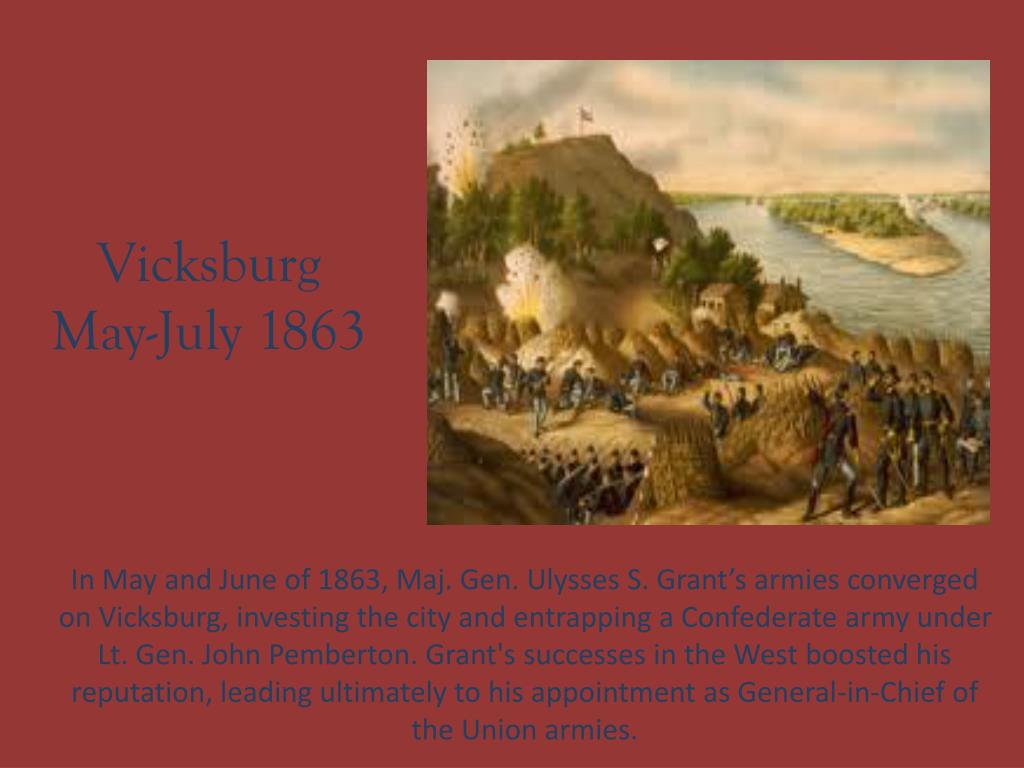 Vicksburg May-July 1863 In May and June of 1863, Maj. Gen. Ulysses S. Grant’s armies converged on Vicksburg, investing the city and entrapping a Confederate army under Lt. Gen. John Pemberton. Grant's successes in the West boosted his reputation, leading ultimately to his appointment as General-in-Chief of the Union armies.