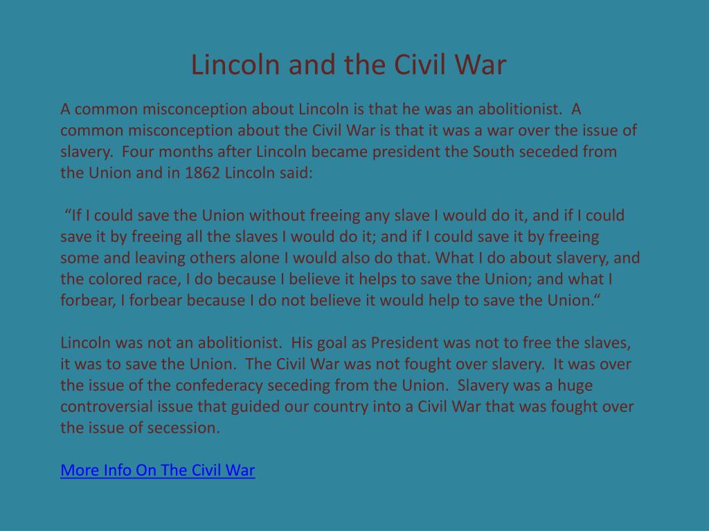 Lincoln and the Civil War A common misconception about Lincoln is that he was an abolitionist. A common misconception about the Civil War is that it was a war over the issue of slavery. Four months after Lincoln became president the South seceded from the Union and in 1862 Lincoln said: “If I could save the Union without freeing any slave I would do it, and if I could save it by freeing all the slaves I would do it; and if I could save it by freeing some and leaving others alone I would also do that. What I do about slavery, and the colored race, I do because I believe it helps to save the Union; and what I forbear, I forbear because I do not believe it would help to save the Union.“ Lincoln was not an abolitionist. His goal as President was not to free the slaves, it was to save the Union. The Civil War was not fought over slavery. It was over the issue of the confederacy seceding from the Union. Slavery was a huge controversial issue that guided our country into a Civil War that was fought over the issue of secession. More Info On The Civil War