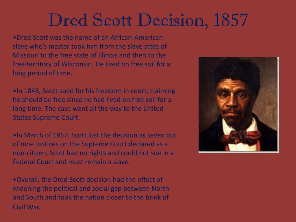 Dred Scott Decision, 1857 • Dred Scott was the name of an African-American slave who’s master took him from the slave state of Missouri to the free state of Illinois and then to the free territory of Wisconsin. He lived on free soil for a long period of time. • In 1846, Scott sued for his freedom in court, claiming he should be free since he had lived on free soil for a long time. The case went all the way to the United States Supreme Court. • In March of 1857, Scott lost the decision as seven out of nine Justices on the Supreme Court declared as a non-citizen, Scott had no rights and could not sue in a Federal Court and must remain a slave. • Overall, the Dred Scott decision had the effect of widening the political and social gap between North and South and took the nation closer to the brink of Civil War.