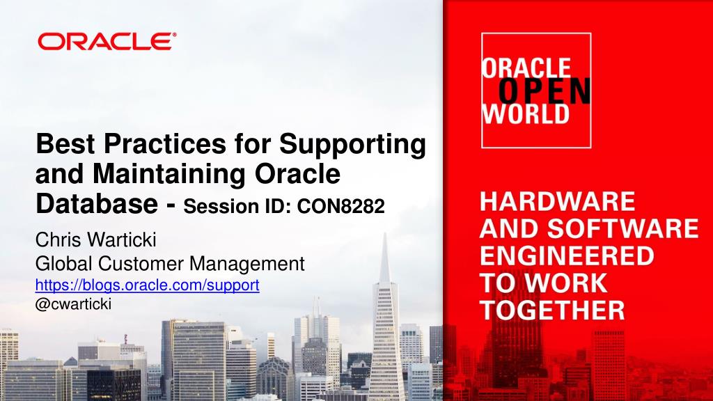 Best Practices for Supporting and Maintaining Oracle Database - Session ID: CON8282. Chris Warticki Global Customer Management https://blogs.oracle.com/support @ cwarticki.
