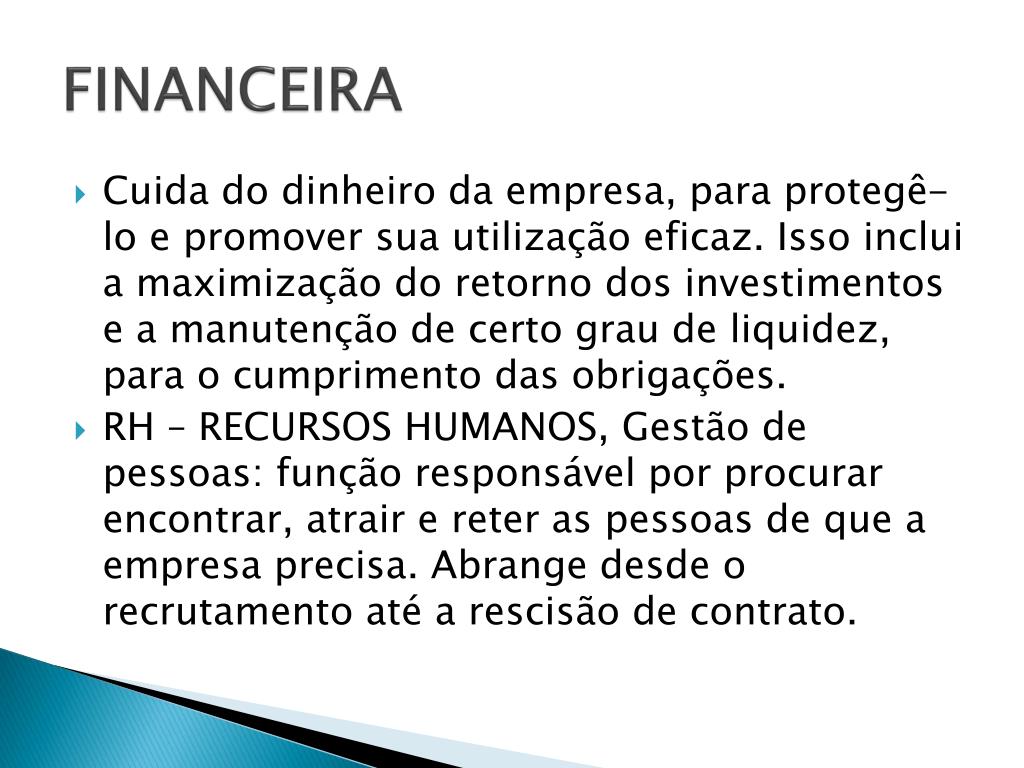 FINANCEIRA • Cuida do dinheiro da empresa, para protegê-lo e promover sua utilização eficaz. Isso inclui a maximização do retorno dos investimentos e a manutenção de certo grau de liquidez, para o cumprimento das obrigações. • RH – RECURSOS HUMANOS, Gestão de pessoas: função responsável por procurar encontrar, atrair e reter as pessoas de que a empresa precisa. Abrange desde o recrutamento até a rescisão de contrato.