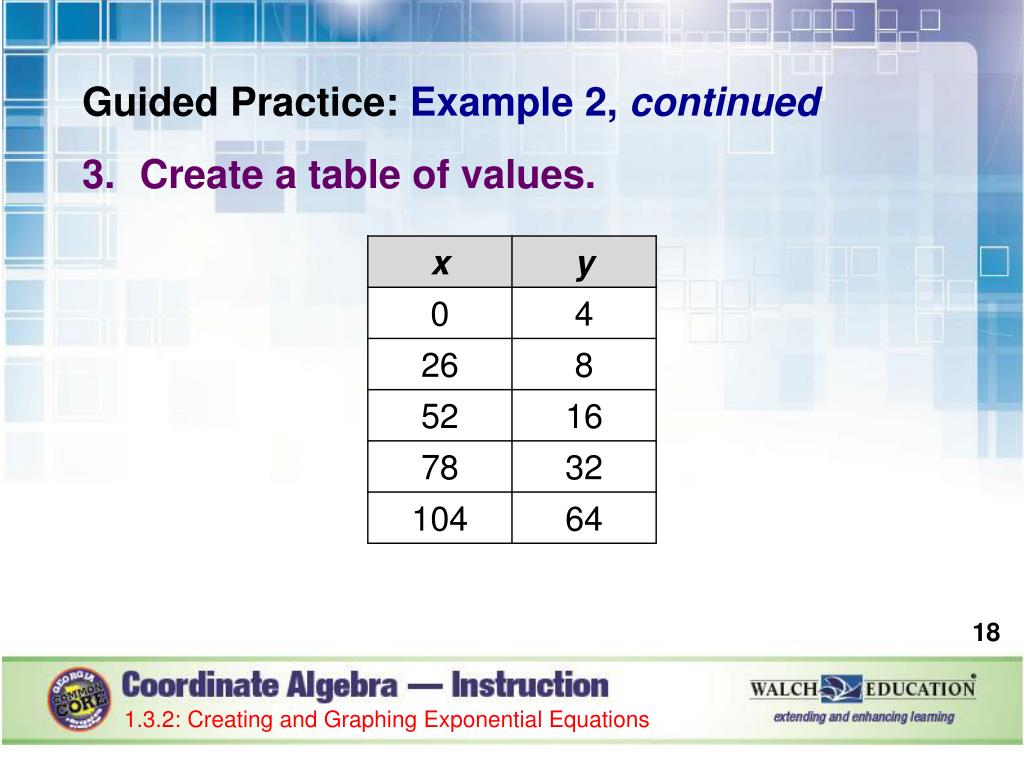 Guided Practice: Example 2, continued Create a table of values. 1.3.2: Creating and Graphing Exponential Equations