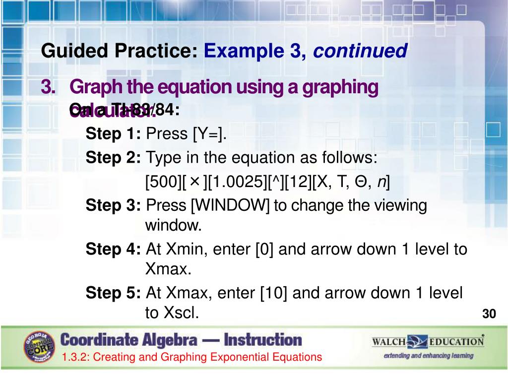 Guided Practice: Example 3, continued Graph the equation using a graphing calculator. • On a TI-83/84: • Step 1: Press [Y=]. • Step 2: Type in the equation as follows: • [500][×][1.0025][^][12][X, T, Θ, n] • Step 3: Press [WINDOW] to change the viewing window. • Step 4: At Xmin, enter [0] and arrow down 1 level to Xmax. • Step 5: At Xmax, enter [10] and arrow down 1 level to Xscl. 1.3.2: Creating and Graphing Exponential Equations