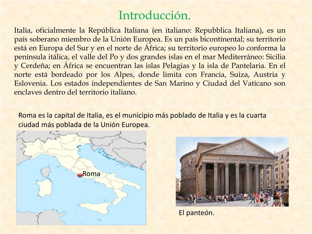 Introducción. Italia, oficialmente la República Italiana (en italiano: Repubblica Italiana), es un país soberano miembro de la Unión Europea. Es un país bicontinental; su territorio está en Europa del Sur y en el norte de África; su territorio europeo lo conforma la península itálica, el valle del Po y dos grandes islas en el mar Mediterráneo: Sicilia y Cerdeña; en África se encuentran las islas Pelagias y la isla de Pantelaria. En el norte está bordeado por los Alpes, donde limita con Francia, Suiza, Austria y Eslovenia. Los estados independientes de San Marino y Ciudad del Vaticano son enclaves dentro del territorio italiano. Roma es la capital de Italia, es el municipio más poblado de Italia y es la cuarta ciudad más poblada de la Unión Europea. Roma El panteón.