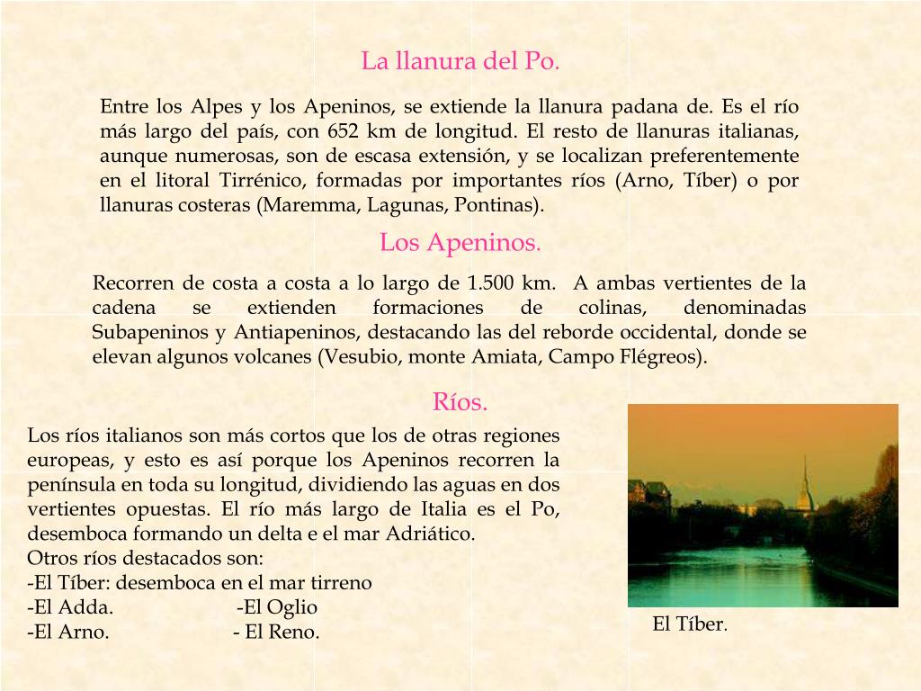 La llanura del Po. Entre los Alpes y los Apeninos, se extiende la llanura padana de. Es el río más largo del país, con 652 km de longitud. El resto de llanuras italianas, aunque numerosas, son de escasa extensión, y se localizan preferentemente en el litoral Tirrénico, formadas por importantes ríos (Arno, Tíber) o por llanuras costeras (Maremma, Lagunas, Pontinas). Los Apeninos. Recorren de costa a costa a lo largo de 1.500 km. A ambas vertientes de la cadena se extienden formaciones de colinas, denominadas Subapeninos y Antiapeninos, destacando las del reborde occidental, donde se elevan algunos volcanes (Vesubio, monte Amiata, Campo Flégreos). Ríos. • Los ríos italianos son más cortos que los de otras regiones europeas, y esto es así porque los Apeninos recorren la península en toda su longitud, dividiendo las aguas en dos vertientes opuestas. El río más largo de Italia es el Po, desemboca formando un delta e el mar Adriático. • Otros ríos destacados son: • -El Tíber: desemboca en el mar tirreno • -El Adda. -El Oglio • -El Arno. - El Reno. El Tíber.