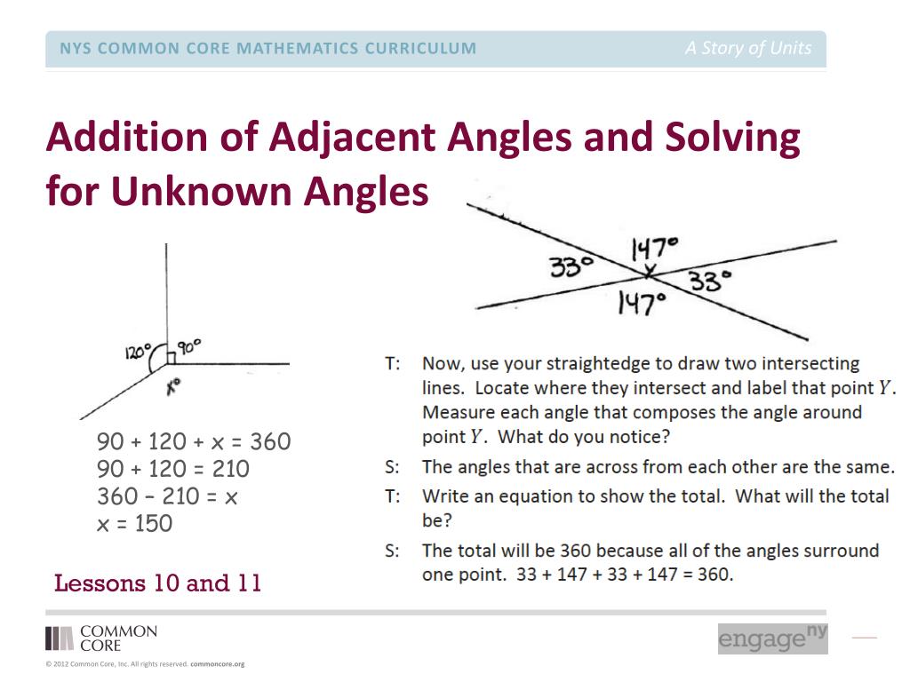 Addition of Adjacent Angles and Solving for Unknown Angles Lessons 10 and 11