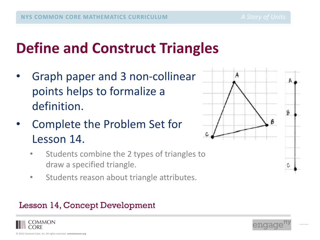 Define and Construct Triangles Lesson 14, Concept Development • Graph paper and 3 non-collinear points helps to formalize a definition. • Complete the Problem Set for Lesson 14. • Students combine the 2 types of triangles to draw a specified triangle. • Students reason about triangle attributes.