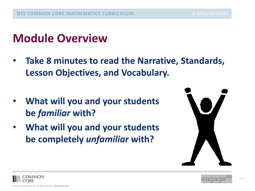 Module Overview • Take 8 minutes to read the Narrative, Standards, Lesson Objectives, and Vocabulary. • What will you and your students be familiar with? • What will you and your students be completely unfamiliar with?