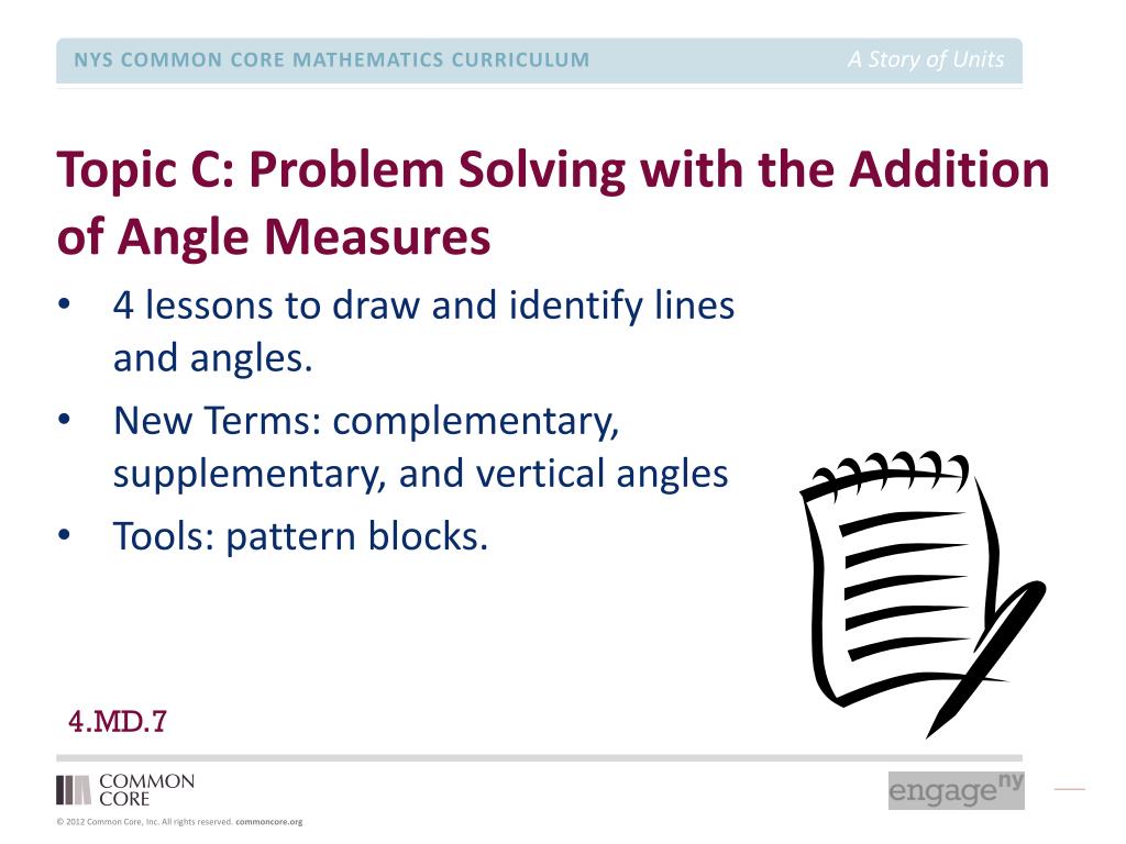 Topic C: Problem Solving with the Addition of Angle Measures 4.MD.7 • 4 lessons to draw and identify lines and angles. • New Terms: complementary, supplementary, and vertical angles • Tools: pattern blocks.