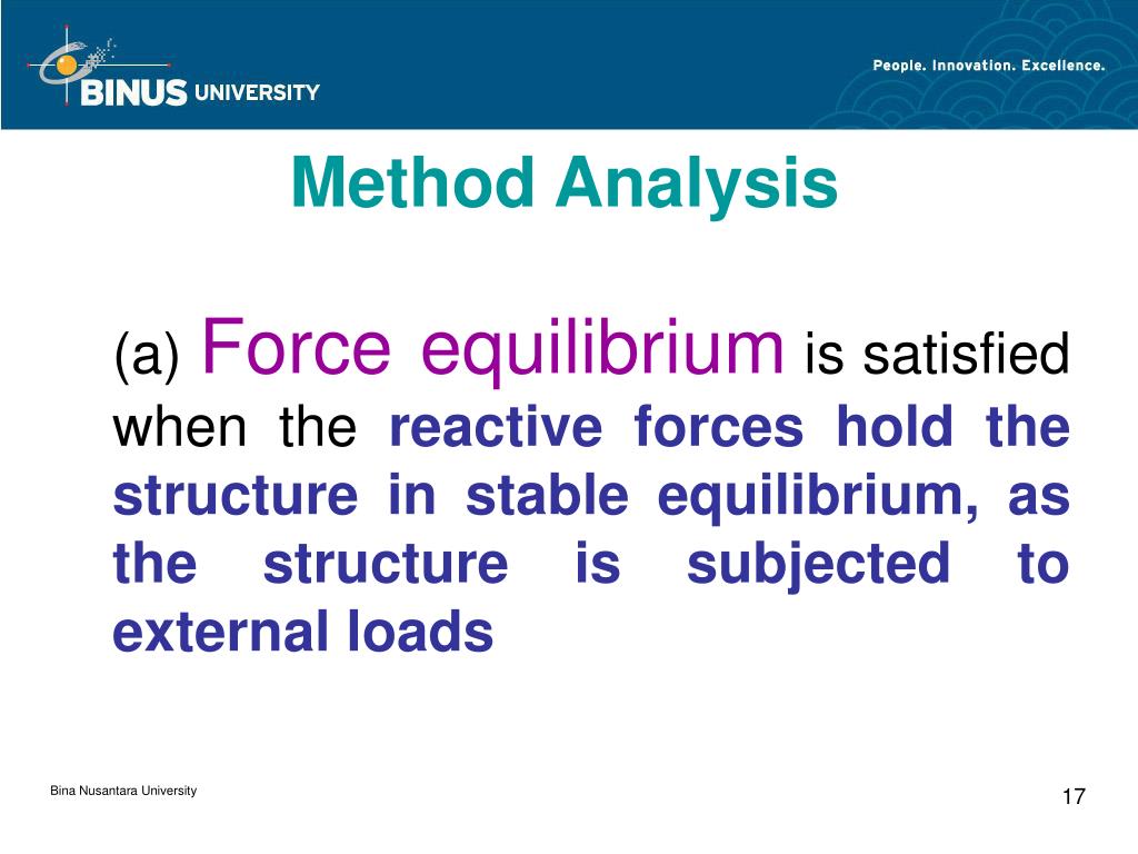 Method Analysis (a) Force equilibrium is satisfied when the reactive forces hold the structure in stable equilibrium, as the structure is subjected to external loads